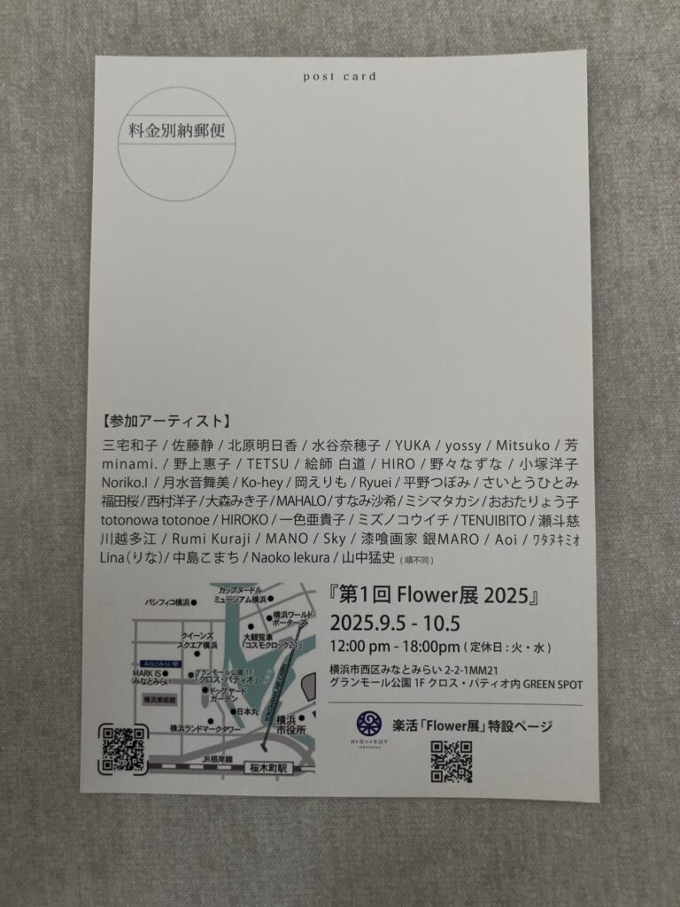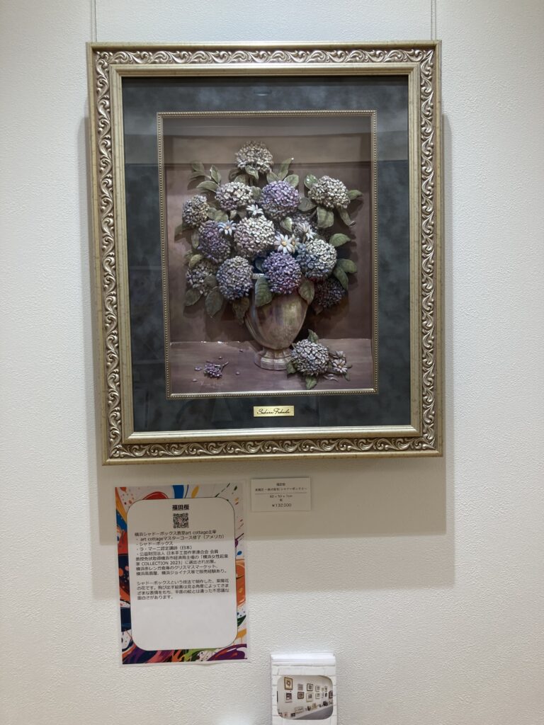 みなとみらいのクロス・パティオで開催されています「第1回FLOWER展」に行って来ました。シャドーボックス・ラ・マーニの福田桜講師が出展しています。2025年9月5日(金)〜10月5日(日)12時〜18時火・水曜日休み、入場無料です。みなとみらい線みなとみらい駅中央改札より徒歩5分です。花をテーマにシャドーボックスの他、絵画や切り絵やアートフラワーなど多くのジャンルの作品を楽しめました。素晴らしい数々の作品の中でも福田桜講師の紫陽花の作品は、細かく丁寧に作られていて、思わず覗き込んでしまいました。お近くにお越しの際は、是非お立ち寄り下さい。