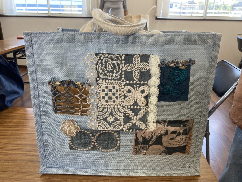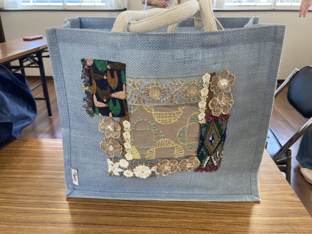 ジュートバックのデコパージュ作品です。厚木教室のSHさんの作品です。ブルーのジュートバックに布やボタンやレースやパールをバランスよく配置していますね。お洒落なバッグになりました。世界で一つしなかいオリジナルバッグでお出かけが楽しくなりますね。
