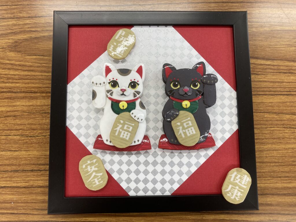 Chiyo Ohno画の「招き猫 白と黒」のシャドーボックス作品です。厚木教室のMYさんの作品です。黒の正方形額に白とシルバーの市松模様の紙を敷き、四方の角に赤い紙を置きました。 素敵💓お洒落な作品に仕上がりました。「安全」「健康」「開運」「福」が訪れますね。プリントは、シャドーボックス・ラ・マーニHPのプリント販売をご覧下さい。