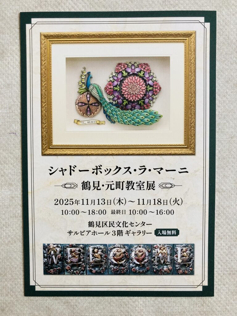 「シャドーボックス・ラ・マーニ鶴見・元町教室展」の開催のお知らせです。2025年11月13日(木)〜11月18日(火)10時〜18時(最終日16時まで)鶴見区民文化センターサルビアホール3階ギャラリー(横浜市鶴見区鶴見中央1-31-2 シークレイン内)で開催されます。入場無料です。シャドーボックス・ラ・マーニ若山憲子講師と室田玲子講師の教室展です。ご高覧頂けると嬉しいです。