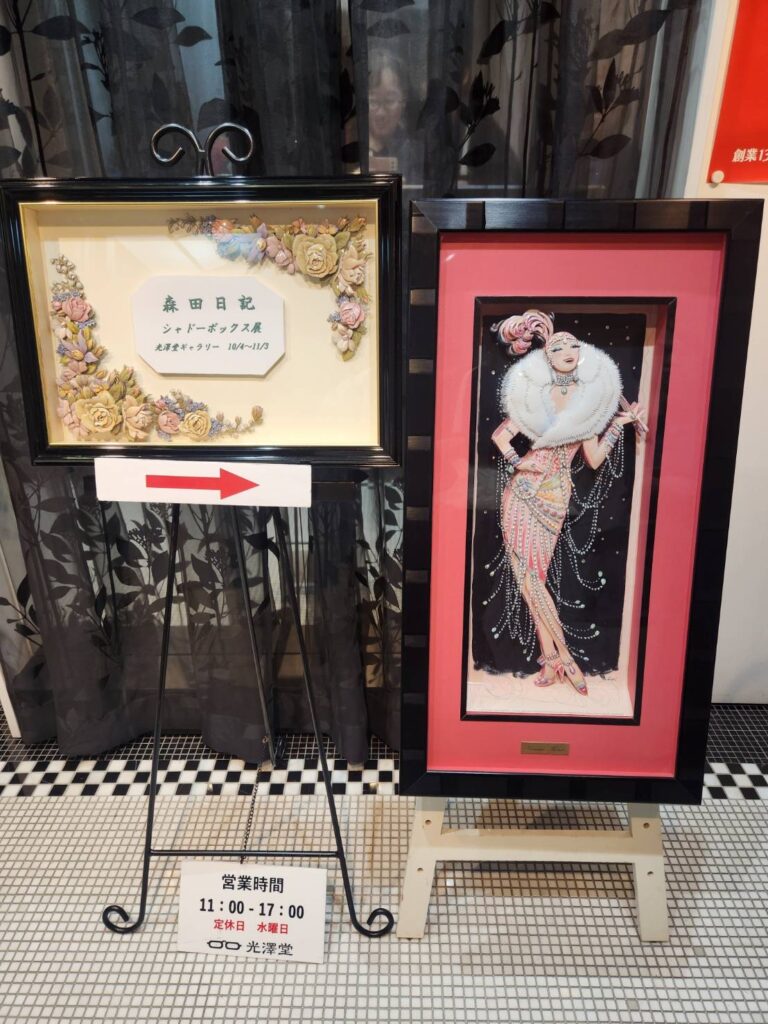 銀座光澤堂ギャラリーで2025年10月4日(土)から11月3日(月)11時〜17時開催されている「森田日記シャドーボックス展」に横浜教室と目黒学園カルチャースクールの方々と行って来ました。ご自分て作られた額やマットと作品1つ1つの丁寧な仕上げに感動して刺激を受けて帰ってきました。私が若い頃、11PMに出演していた森田日記さんが、目の前にいらっしゃる事も不思議でした。変わらないスタイルに羨ましい限りでした。