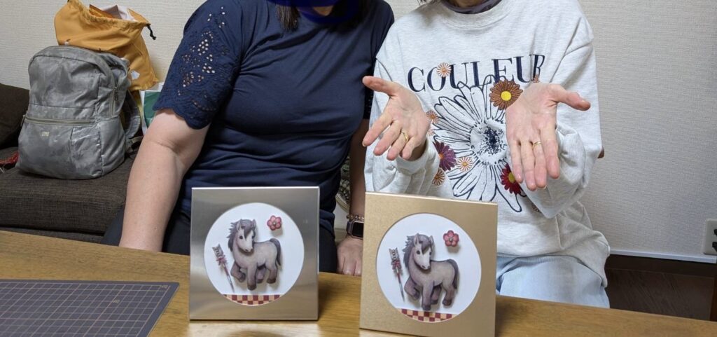 Chiyo Ohno画の「干支の午」のシャドーボックス作品です。横浜教室のMS講師が友人お二人にワークショップを行いました。以前に一度シャドーボックスを体験されていたお二人ですが、一年ぶりと言うのに、とてもよく出来ていますね。楽しい時間を過ごされたこ事と思います。