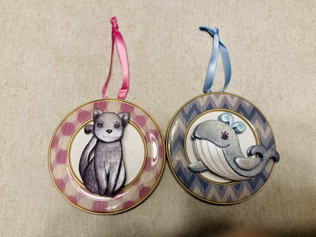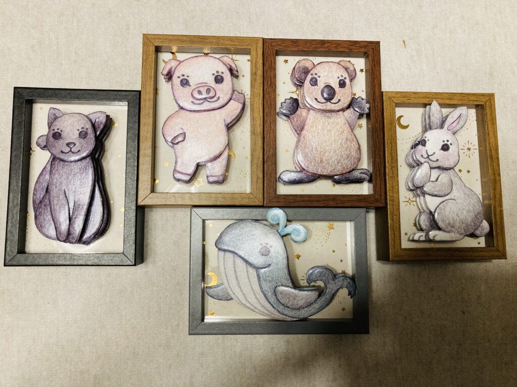 Chiyo Ohno画の新作プリント「ラッキーアニマル」のブタ、クァッカ、ウサギ、ネコ、クジラのシャドーボックス作品です。絵を描いてくださった横浜教室のChiyo Ohnoさんの作品です。簡単プリントで可愛い動物達です。幸運を呼ぶ動物達です。是非体験教室やワークショップで作ってみてください。