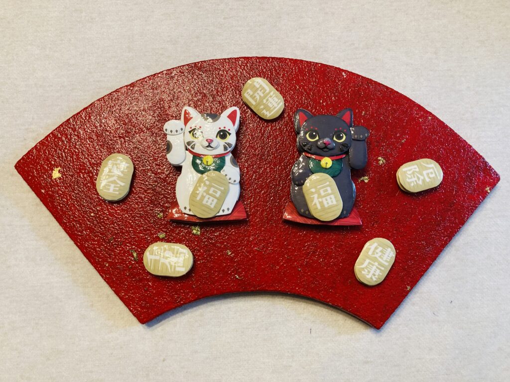 Chiyo Ohno画の「招き猫白と黒」のシャドーボックス作品です。横浜教室のHSさんの作品です。扇形のプラークに朱色の絵の具を塗り金箔を散らしました。お正月に飾りたい作品ですね。プリントは、シャドーボックス・ラ・マーニHPのプリント販売をご覧下さい。