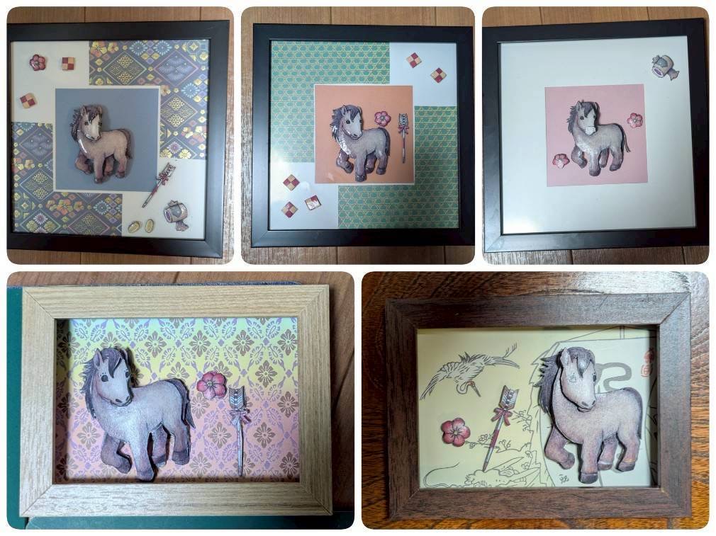 Chiyo Ohno画の「干支の午」のシャドーボックス作品です。横浜教室のMTさんの友人5人の作品です。娘さんの高校時代の役員で仲良しになった方達と20年以上のお付き合いだそうです。旅行に行ったりシャドーボックスをしたり、お酒を呑んだりのお付き合いだそうです。素敵なお仲間ですね。毎年年末には干支のシャドーボックスを作られているので、あっという間に完成したそうです。それぞれ個性のある作品で素敵です。