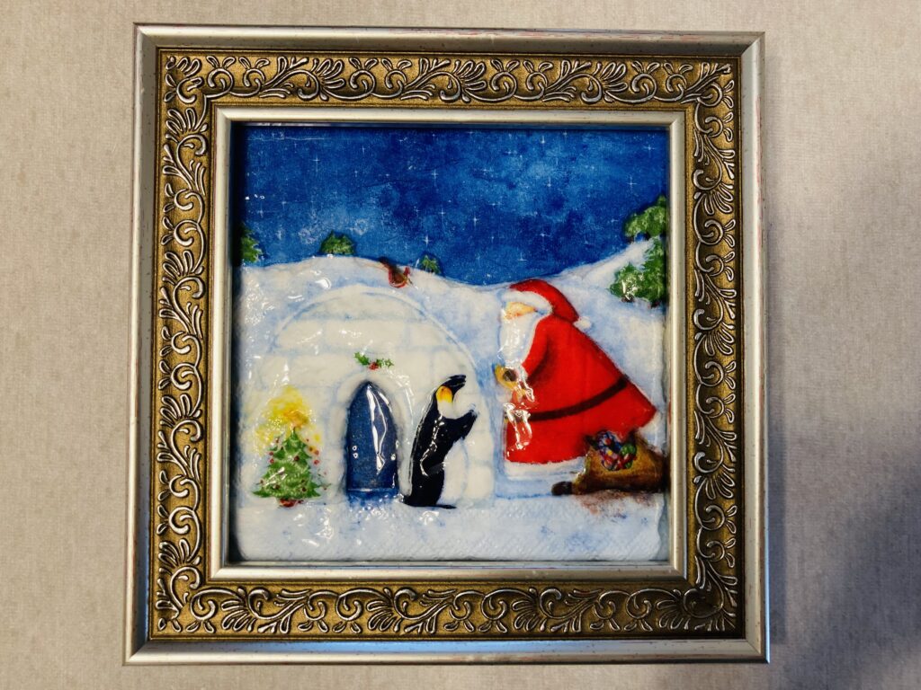 「サンタさんとペンギン」のルプゼ作品 で「サンタさんとペンギン」のルプゼ作品です。厚木教室のNMさんの作品です。紙ナプキンに紙粘土を入れたルプゼ立体感のある作品に仕上げました。ゴールドの額ともマッチしていて素敵です。クリスマスが待ち遠しいですね。 投稿ナビゲーション 前の記事「青葉区民芸術祭2025作品展」開催のお知らせ 2025年11月24日 s_youriko 未分類 コメントを残す