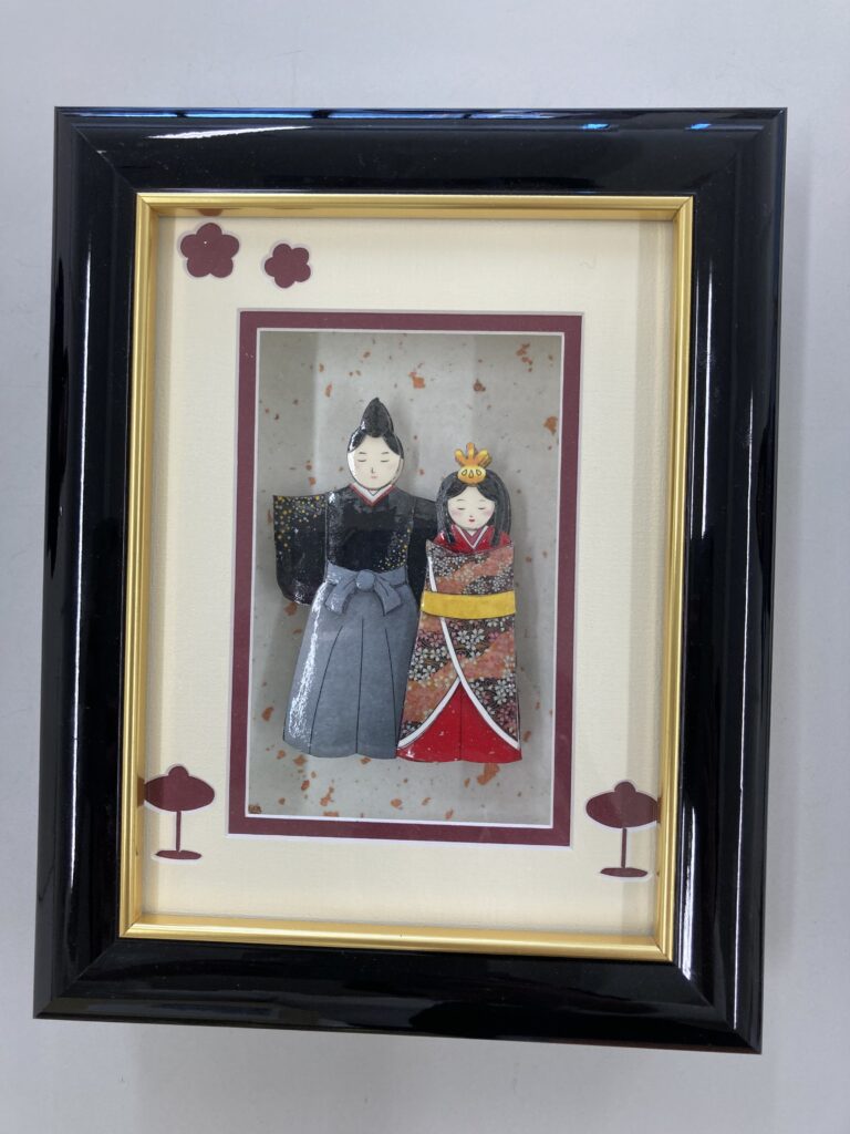 福谷真美画の「立ち雛」のシャドーボックス作品です。目黒学園カルチャースクールのOYさんの作品です。お雛様のイメージの飾りマットにゴールドのラインの入った黒の塗り額にいれました。男雛と女雛の高さのバランスもよく出来ています。素敵ですね。ひな祭りが楽しみです。