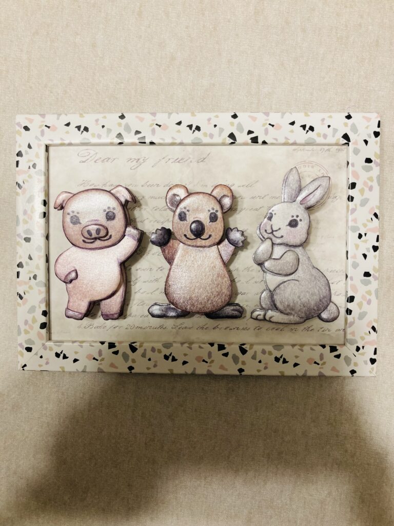 Chiyo Ohno画のラッキーアニマル「ウサギとブタとクァッカ」のシャドーボックス作品です。絵を描いてくださった横浜教室のChiyo Ohnoさんの作品です。可愛い❤️癒されます。プレゼントにいかがですか?プリントは、シャドーボックス・ラ・マーニHPのプリント販売をご覧下さい。
