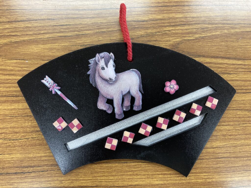 Chiyo Ohno画の「干支の午」のシャドーボックス作品です。厚木教室のMYさんの作品です。扇形の黒の塗りのプラークに乗せました。斜めにプラークの抜けている部分に裏からシルバーの紙を貼りました。作品が引き締まって素敵です。プリントは、シャドーボックス・ラ・マーニHPのプリント販売をご覧下さい。