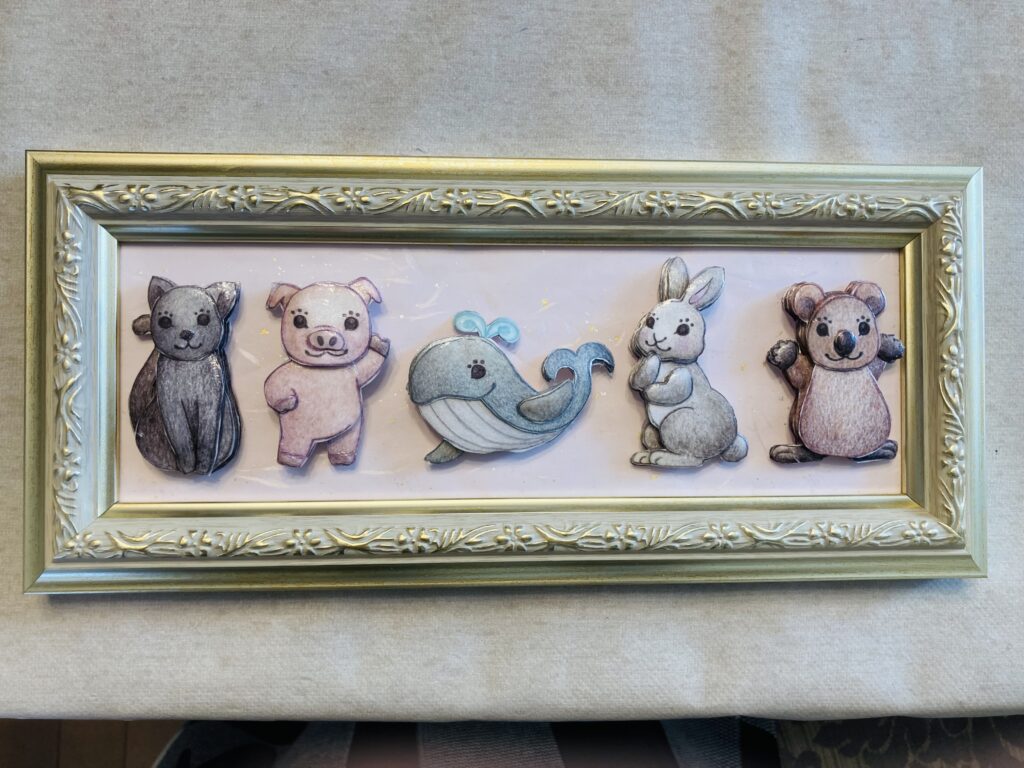 「ラッキーアニマル」のシャドーボックス作品 Chiyo Ohno画の「ラッキーアニマル」のシャドーボックス作品です。厚木教室のNMさんの作品です。横長のお洒落な額に入れました。可愛い❤️❤️❤️幸運が訪れそうな作品です。癒されます。 投稿ナビゲーション 前の記事「干支の午」のシャドーボックス作品 2025年12月10日 s_youriko 未分類 コメントを残す