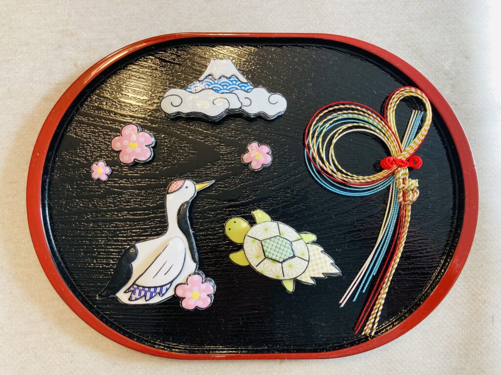 福谷真美画の「鶴、亀、富士」のシャドーボックス作品です。横浜教室のHIさんの作品です。100円ショップの黒の塗りのお盆に乗せました。おめでたい作品で、お正月に飾れてよかったです。良い年になりそうです。プリントはシャドーボックス・ラ・マーニHPのプリント販売をご覧下さい。