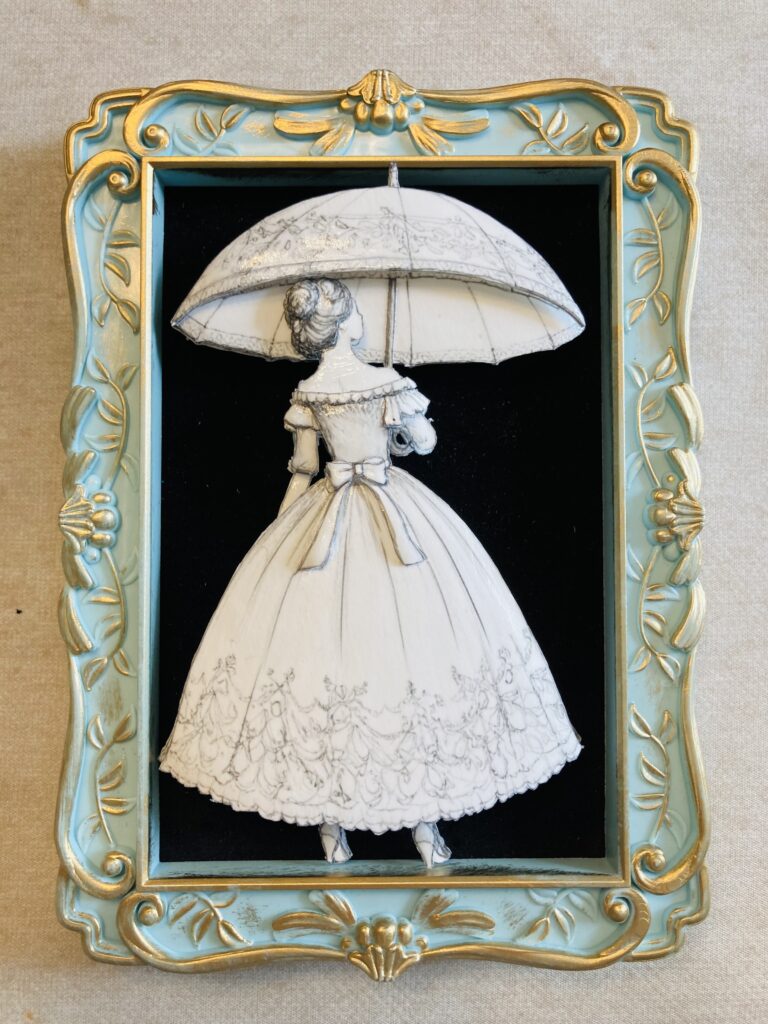 福谷真美画の「傘の貴婦人」のシャドーボックス作品です。横浜教室のHIさんの作品です。黒のベルベットを土台に敷きました。お洒落なな写真額ですね。100円ショップの額とは思えません。お洒落な作品になりました。プリントはシャドーボックス・ラ・マーニHPのプリント販売をご覧下さい。