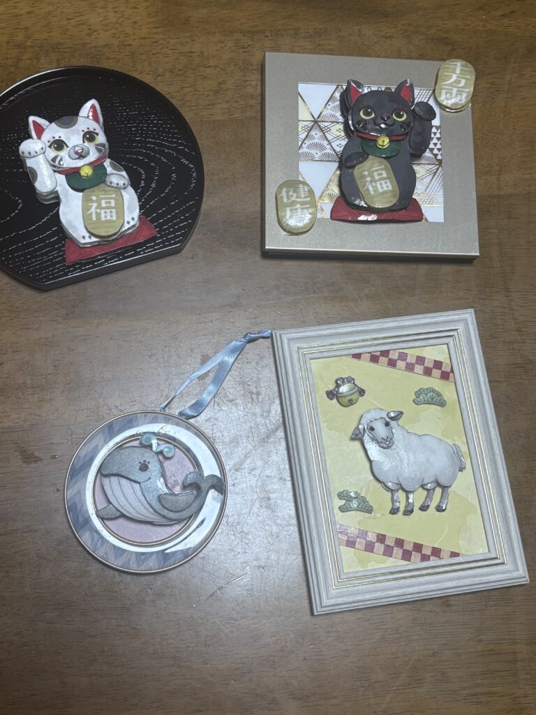 シャドーボックス・ラ・マーニのSM講師とMS講師が友人4人に体験教室を開催しました。画像上は、Chiyo Ohno画の「招き猫」白と黒、画像下はChiyo Ohno画の「ラッキーアニマルクジラ」と「干支の未」です。ワイワイおしゃべりしながら楽しく制作されたそうです。皆さん、初めてとは思えない出来ですね。体験教室の後は、持ち寄りの食事会になったそうです。私も参加したかったです。笑