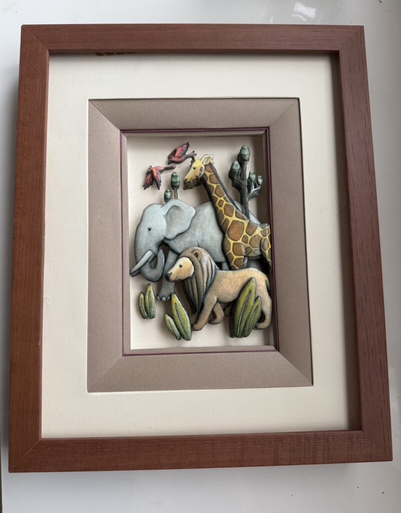 Chiyo Ohno画の「Animals」のシャドーボックス作品です。横浜教室のHNさんの作品です。フランス額装で仕上げました。お洒落な作品になりましたね。プリントは、シャドーボックス・ラ・マーニHPのプリント販売をご覧下さい。