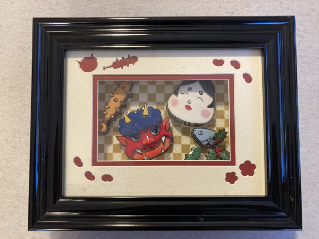 福谷真美画の「柊鰯」のシャドーボックス作品です。節分と言えば柊と鰯ですよね。古くからの日本の風習として伝えられている節分の飾りです。「ひいらぎの枝」に焼いた「いわしの頭」を刺したものを指すそうです。「ひいらぎいわし」はただの飾りではなく、節分の鬼が嫌いな葉っぱである、尖ったトゲのあるひいらぎと、鬼が嫌がる臭いのいわしを組み合わせて飾ることで「鬼が家に来ないように」という魔除けの意味合いが含まれているそうです。
