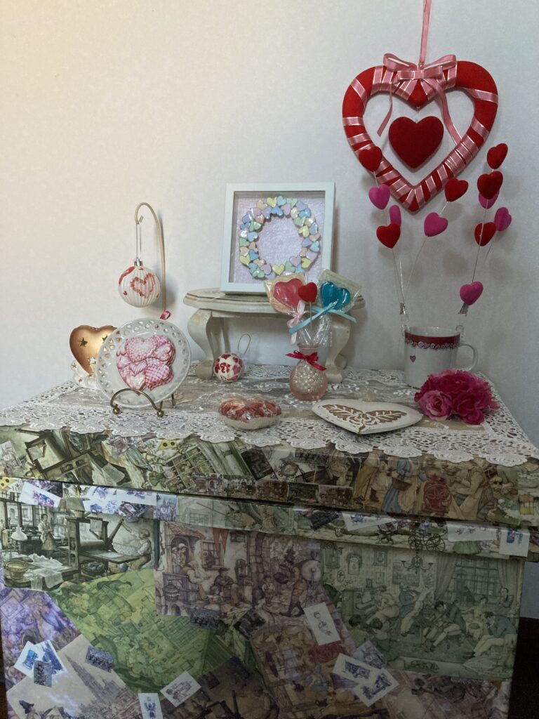 バレンタインデーの飾りです。2月14日はバレンタインデーです。ハートをたくさん飛ばしました。ハートでちょっと幸せな気持ちになりますね。画像左下は、湯本千絵画の「ハート」です。プリントは、シャドーボックス・ラ・マーニHPのプリント販売をご覧下さい。