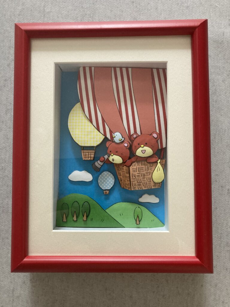 新作プリントのご紹介です。福谷真美画の「クマちゃん気球」のシャドーボックス作品です。絵を描いてくださった横浜教室の福谷真美さんの作品です。もうすぐ子供の日です。子供の日にぴったりの作品ですね。赤い額げ作品を引き立てていやす。プリントは、シャドーボックス・ラ・マーニHPのプリント販売をご覧下さい。