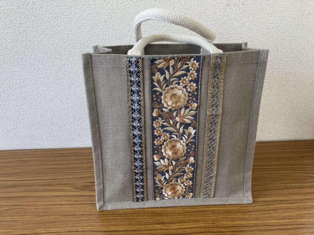 「ジュートバック」のデコパージュ作品 ジュートバックのデコパージュ作品です。厚木教室のSMさんの作品です。グレーのジュートバックに柄の違うインド刺繍のリボンテープを貼りました。それぞれ個性のあるリボンテープなのに、マッチしています、センスが光っていますね。 投稿ナビゲーション 前の記事「Animals」のシャドーボックス作品 2026年3月31日 s_youriko 未分類 コメントを残す