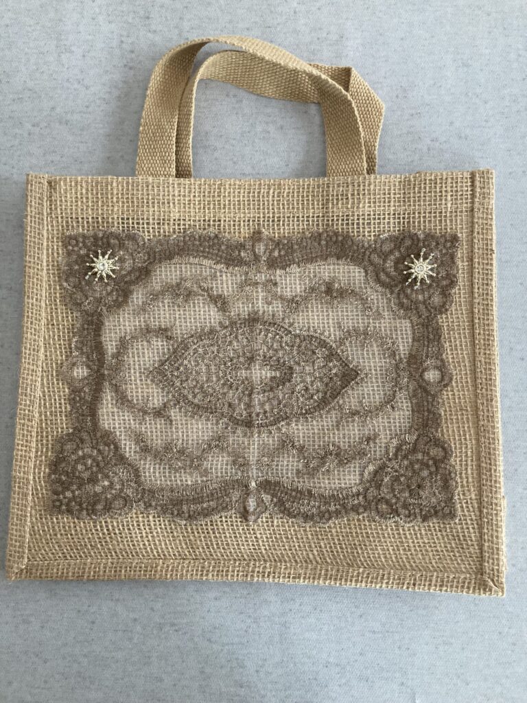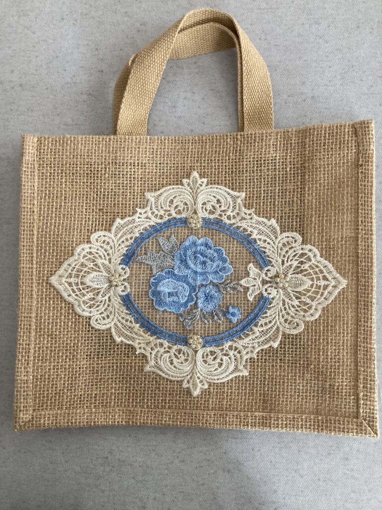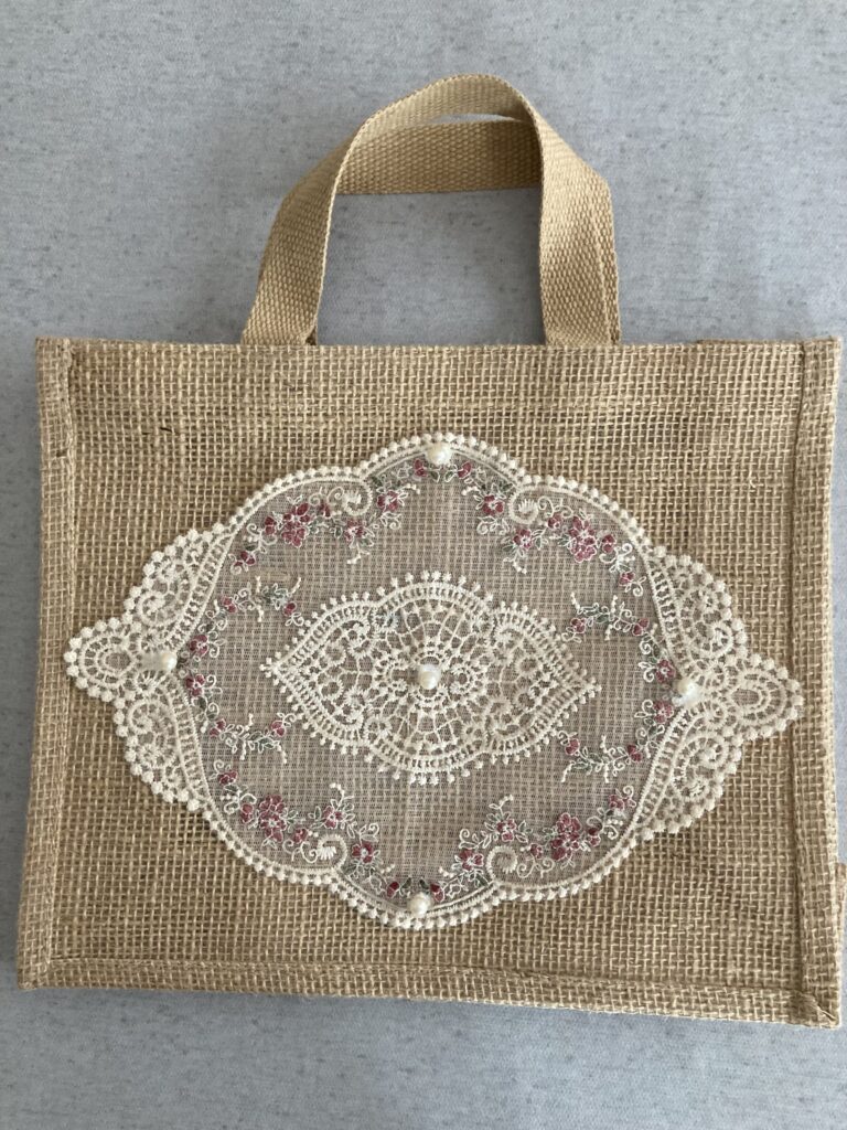 「ジュートバック」のデコパージュ作品です。ジュートバックにレースを裏表に貼り、3作品作りました。アクセントで家にあったパールやゴールドのパーツを乗せました。100円ショップのジュートバックにレース2枚で330円で完成したとは思えませんよね。笑