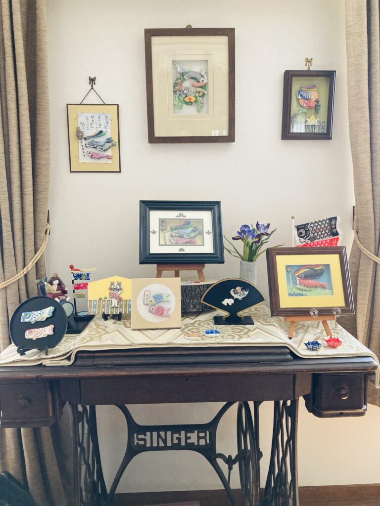 「端午の節句」の飾り その2で鯉のぼりの作品です。5月5日は端午の節句ですね。鯉のぼりが風にたなびいている様子は、元気をもらいますよね。写真右上の茶色の額に入った作品は、福谷真美画の「こいのぼり」です。画像下の黒い額に飾りマットの作品と、画像左の色紙に乗った作品は、福谷真美画の「矢車とこいのぼり」です。額に入れたものと色紙に載せた作品では、同じ絵柄でも随分雰囲気が変わりますよね。プリントは、シャドーボックス・ラ・マーニHPのプリント販売をご覧ください。