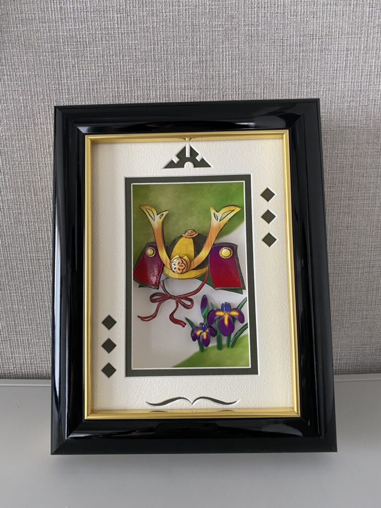 福谷真美画の「兜」のシャドーボックス作品です。目黒学園カルチャースクールのYMさんの作品です。ゴールドのラインの入った黒い塗りの額に、コンピューターカットしたマットに入れました。丁寧に作られています。もうすぐこどもの日です。こどもの日までに完成してよかったです。お部屋に飾ると素敵ですよね。プリントは、シャドーボックス・ラ・マーニHPのプリント販売をご覧ください。